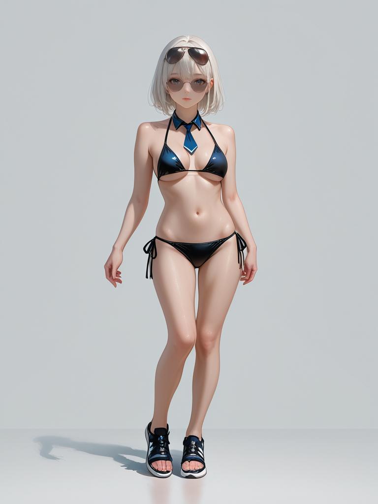 This digital anime-style illustration features a young woman with a slender, toned physique, fair skin, and short black hair with blue highlights. She is bending forward slightly, looking downward with a shy expression. She wears a white, off-shoulder, ruffled crop top that reveals her midriff and a pair of blue, frilled, high-waisted bikini shorts. She is also wearing brown flip-flops. The background is a simple, light gray gradient, and the image is bordered by dark gray on both sides. The lighting creates soft shadows on the white surface she stands on, adding depth to the illustration.