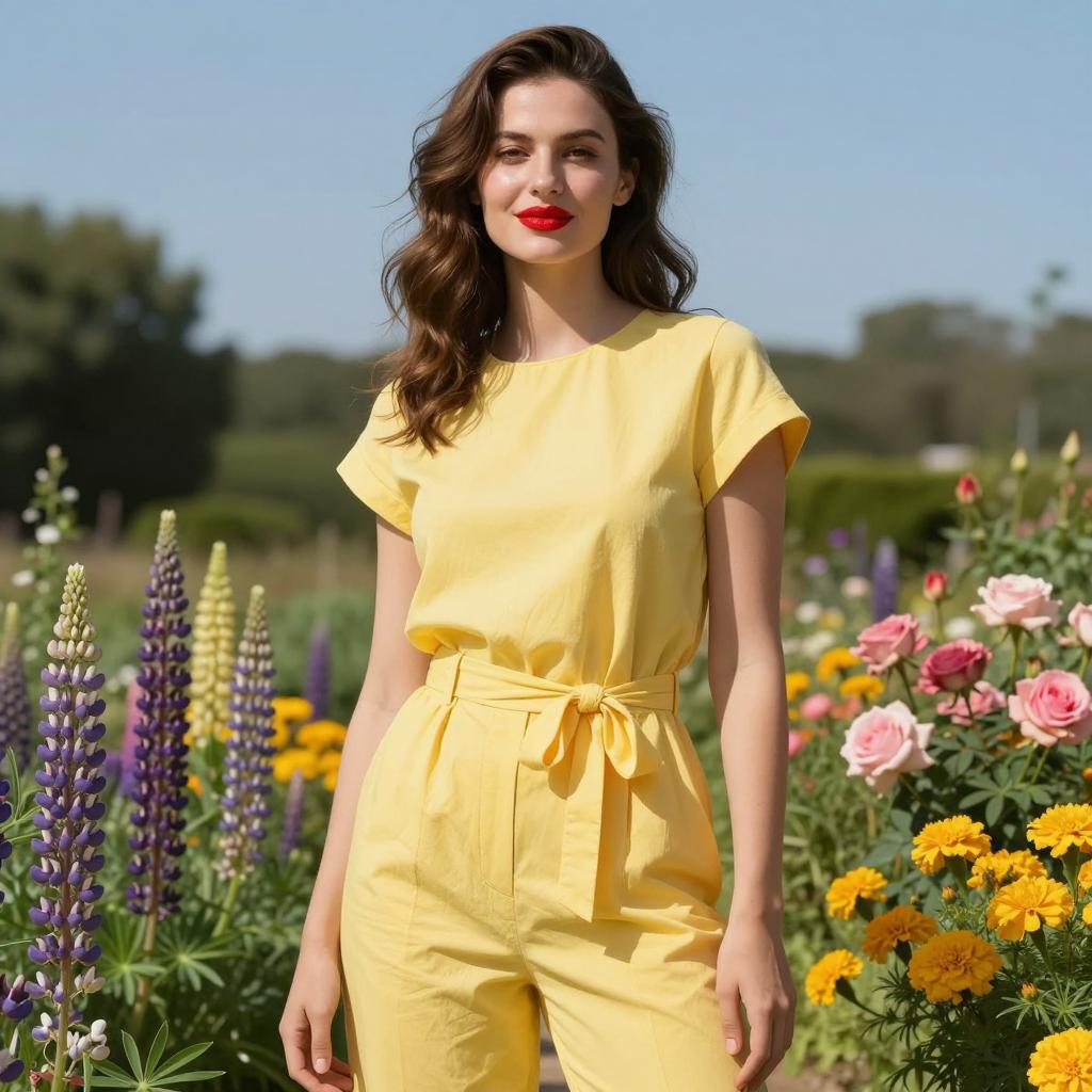 Yellow outfit woman, photorealistic, beautiful woman, standing in vibrant garden, bright yellow dress, short sleeves, tied at waist, matching yellow pants, red lipstick, brown hair, soft waves, light makeup, clear blue sky, colorful flowers, purple lupines, pink roses, yellow marigolds, sunny day, summer, confident expression, slight smile, detailed ure, lush greenery, realistic shadows, daytime, realistic lighting, high quality, outdoor setting