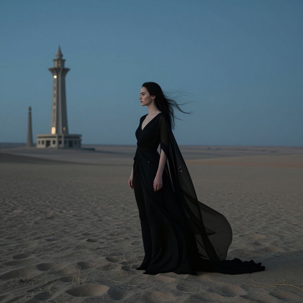 Photograph of a silhouetted woman standing in a desert at sunset. She has long, straight hair and wears a long, black, high-collared dress with long sleeves. Her hands rest by her sides. The sky behind her is a gradient of orange to blue, with the sun low on the horizon. A cloud of dark dust swirls around her legs, adding a sense of motion. Her expression is serious, and the overall mood is dramatic and mysterious. The ground is sandy, and the landscape is barren with no visible vegetation.