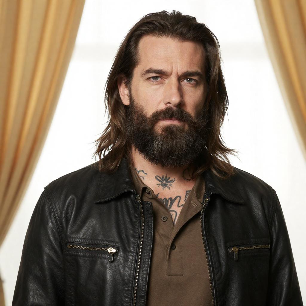 Photograph of a middle-aged man with short, tousled brown hair and a rugged beard, wearing a black trench coat over a black shirt. He stands against a quilted, metallic background with a serious expression. His right hand rests on a black strap. The image has a promotional feel.