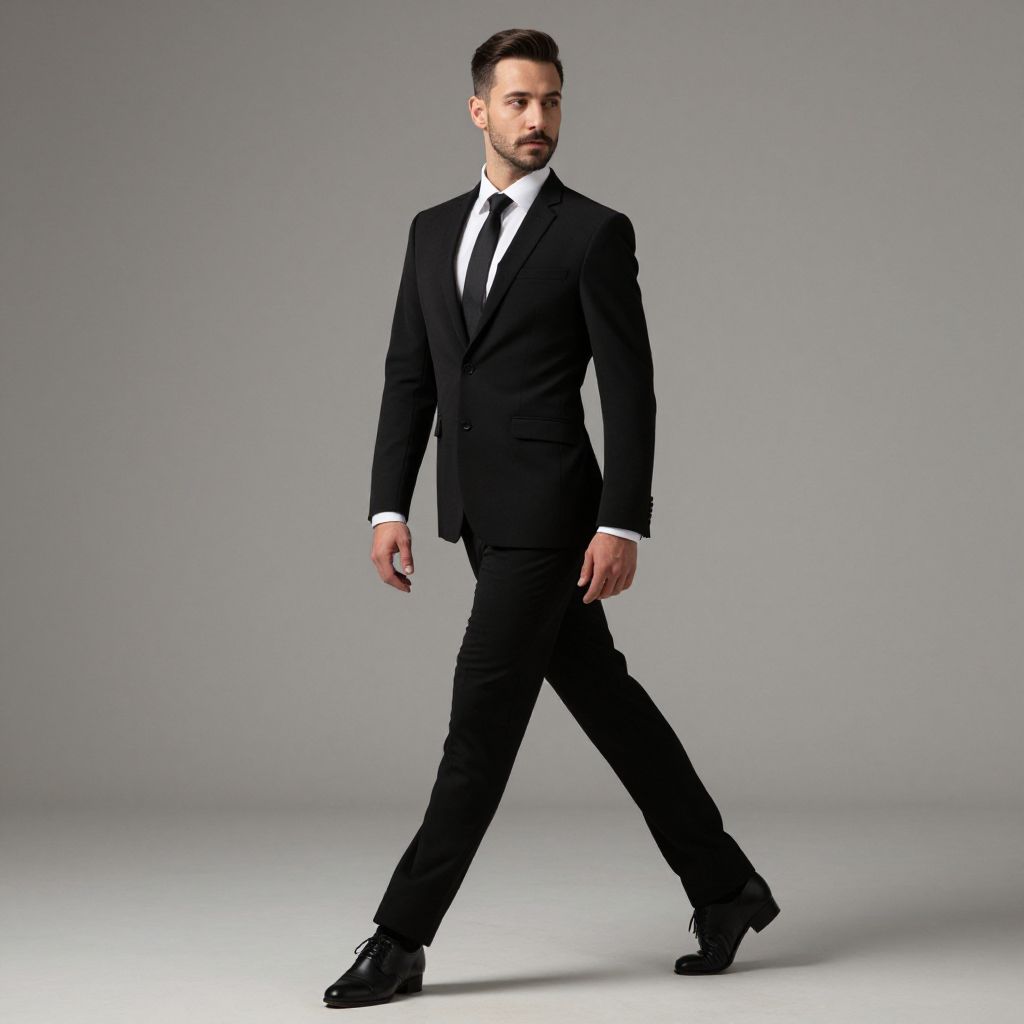 Photograph of a confident man walking against a plain gray background. He has short, dark hair, a trimmed beard, and is wearing a sleek, black tailored suit with a white dress shirt and black tie. His black dress shoes are polished, and he strides forward with a purposeful gait. The lighting is even, highlighting his sharp, professional appearance. The man's expression is focused, and his posture is straight and assertive. The image has a modern, professional style, emphasizing formal attire and business-like demeanor.