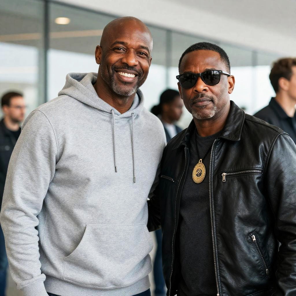 Photograph of two Black men standing indoors in a modern setting. The man on the left is bald, smiling, wearing a gray hoodie. The man on the right has short hair, wearing black sunglasses, a black leather jacket, and a badge around his neck. The background is blurred with glass partitions and other people.