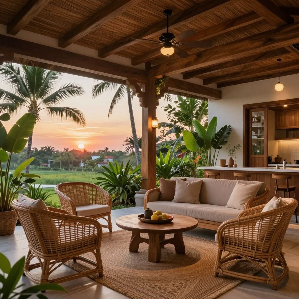 Photograph of a tropical, open-air living room with wicker furniture, white curtains, wooden ceiling, and lush green garden view.