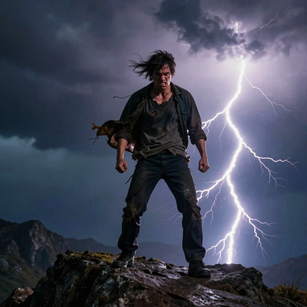 Angryman standing on a mountain cliff during a thunderstorm, lightning striking behind him, face twisted in rage, wind blowing his torn clothes, epic and dramatic atmosphere with realistic textures