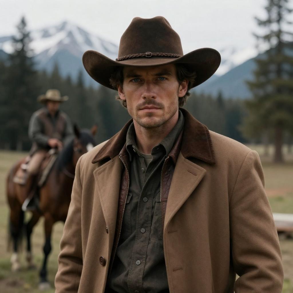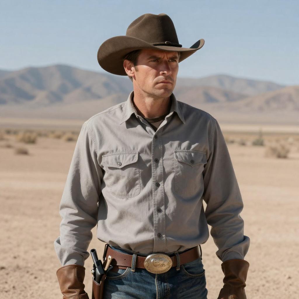 Portrait of a stern white man dressed as a cowboy standing in a vast desert landscape with distant mountains. He wears a brown cowboy hat, grey long-sleeve shirt, blue jeans, brown leather gloves, and a belt with a large buckle. A revolver is holstered at his right side. The barren arid plain and clear sky form the background.