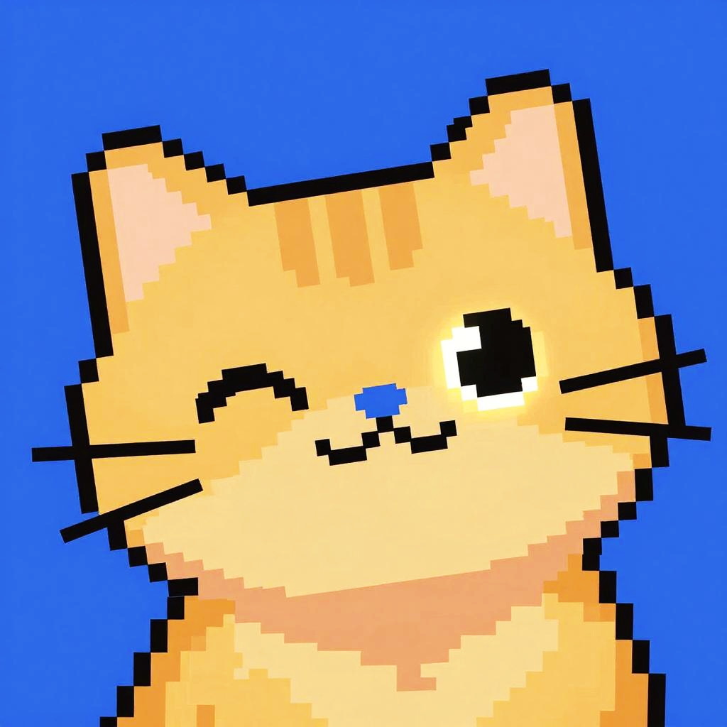 Pixel art cat face, playful expression with a tilted head, bright orange fur with shading, neon pixel glow, 16-bit video game aesthetic