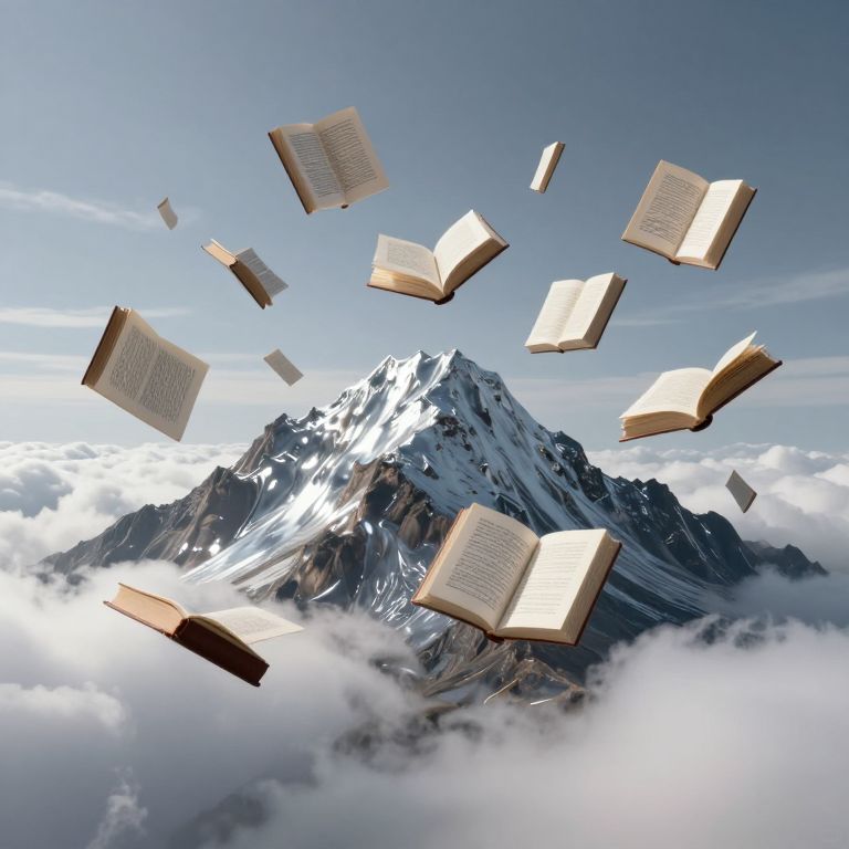 Photograph-like digital illustration depicting open books of varying sizes floating in mid-air against a backdrop of a snow-capped mountain peak surrounded by clouds. The sky is clear and blue, contrasting with the white and gray tones of the mountain and clouds. The books, with visible text and yellowed pages, are scattered in dynamic, upward motion, suggesting an ethereal or magical atmosphere. The mountain's rugged, textured surface is sharply detailed, while the soft, fluffy clouds create a serene, dreamlike setting. The composition combines elements of fantasy and realism.