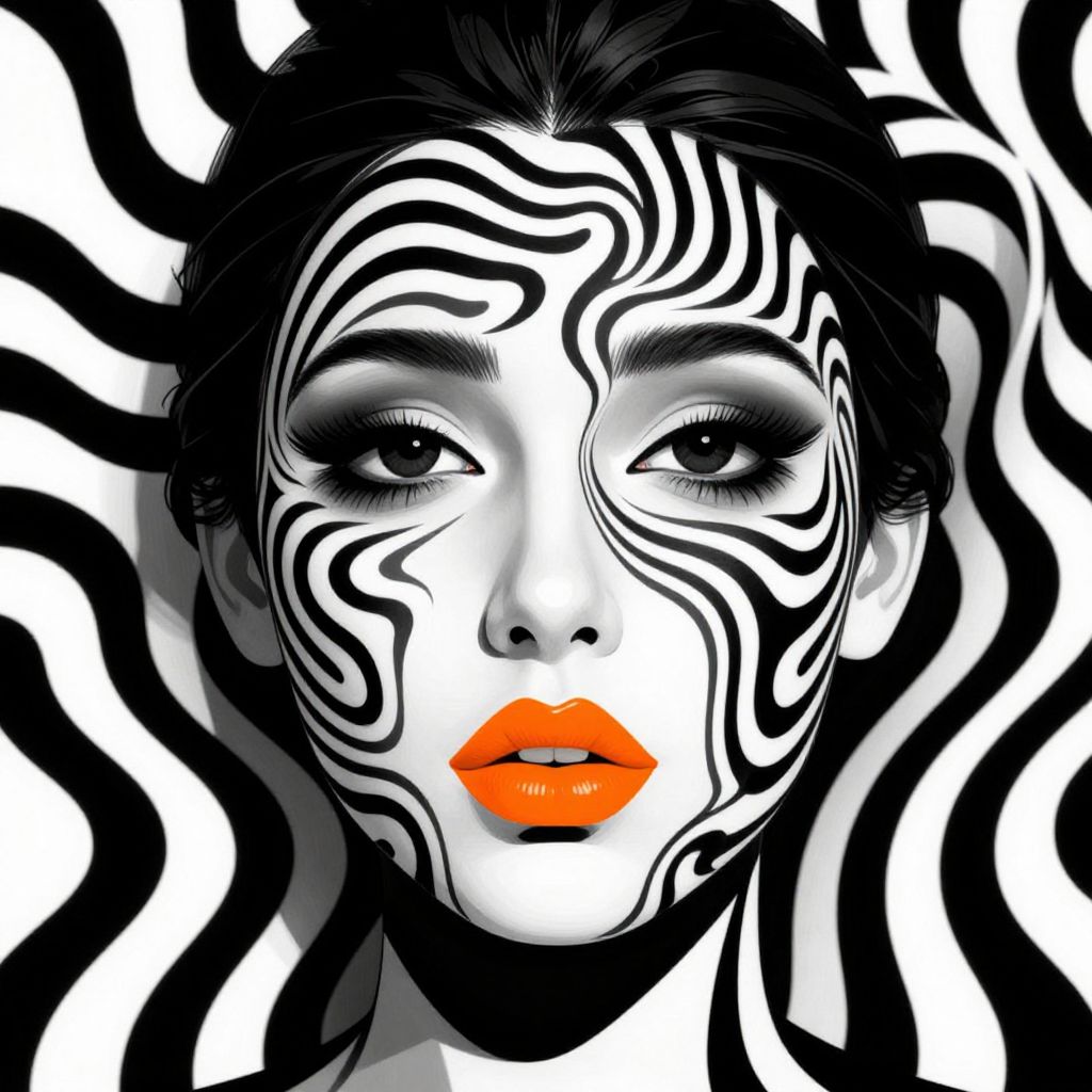 This is a digital pop art portrait of a woman with striking black and white zebra-like patterns covering her face. Her large, almond-shaped eyes have dark, smoky eyeshadow, and her full lips are painted a bold, bright orange. Her long, dark hair is styled back, blending into the pattern. The background is a stark white with black wavy lines radiating outward, enhancing the zebra pattern. The overall style is highly contrasted and modern, emphasizing bold colors and geometric shapes. The woman's expression is neutral, with a hint of intensity.