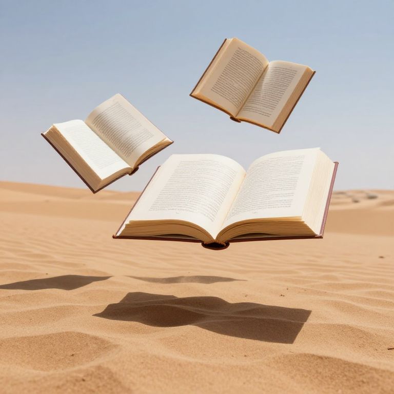 A serene desert landscape is transformed into a surreal realm where open books float effortlessly above the sand, their pages turning as if guided by unseen hands, casting shadows that mirror the stories they contain.