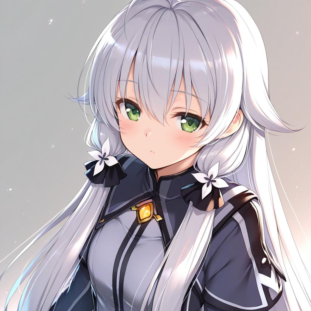 Digital illustration of an anime girl featuring very long, white hair styled with sidelocks and hair flaps. She has striking green eyes and a slightly blushing expression. The character wears a dark outfit with a high collar, detailed with a yellow gem and white accents, inspired by the style of artist Yaegashi Nan. The background is soft grey, emphasizing the character's delicate features.