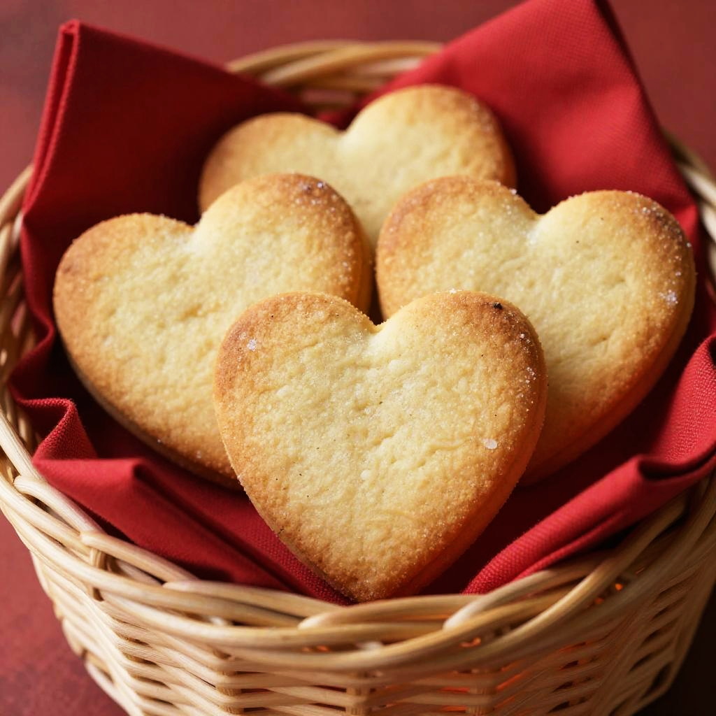 A close-up photo of a wicker basket filled with heart-shaped cookies, lightly dusted with sugar. The cookies are golden brown and stacked on top of each other. Red fabric napkins are folded and tucked around the basket, adding a cozy touch. The background is a warm, blurred red, making the cookies and napkins stand out. The image has a soft, inviting feel.