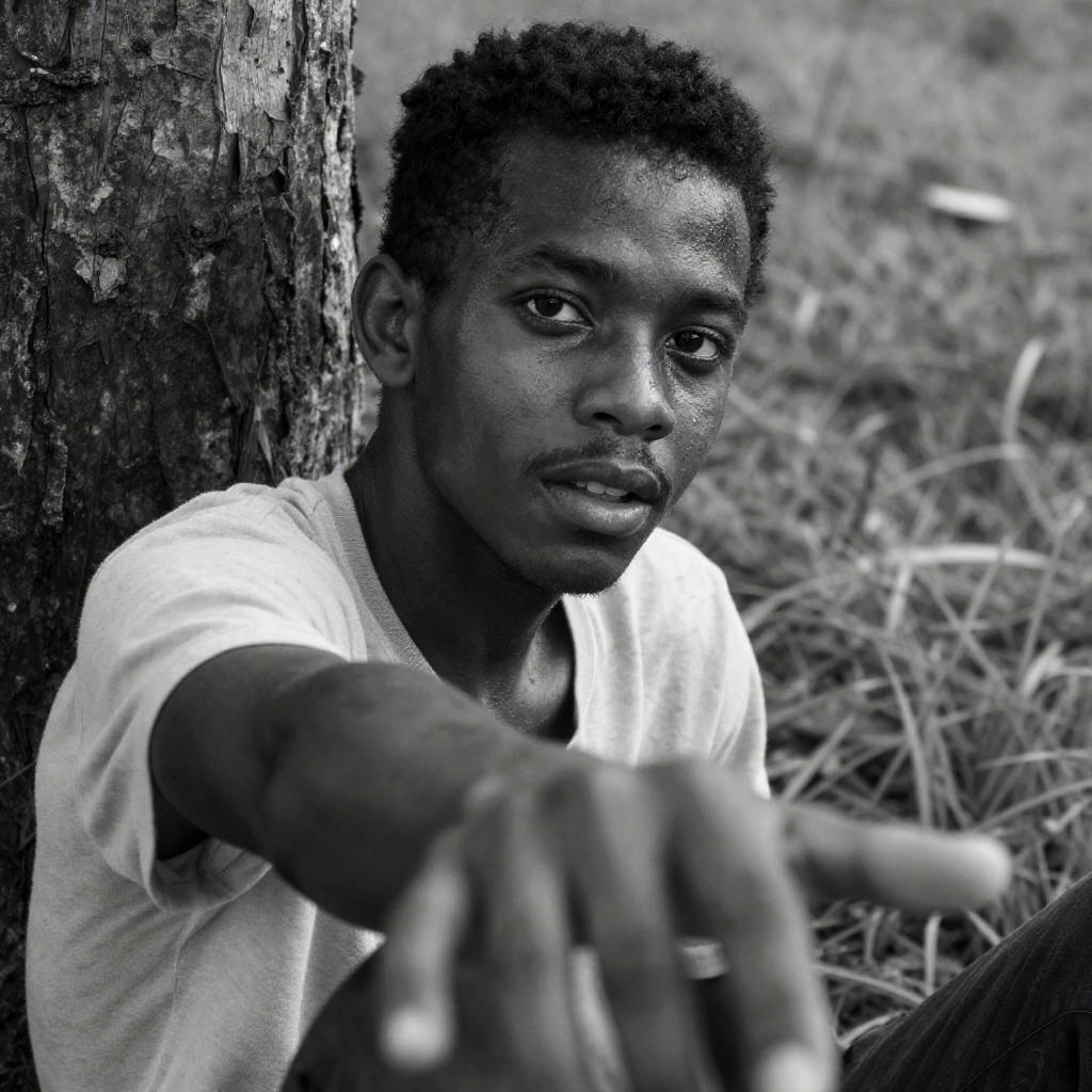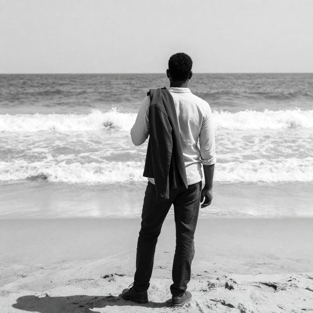 Black and white photograph. Man with dark skin, short hair, wearing a light shirt and dark pants, stands on a beach, holding a dark jacket over his shoulder. Ocean waves crash in the background. Man faces the sea, back to the camera. Sand covers the bottom of the image.