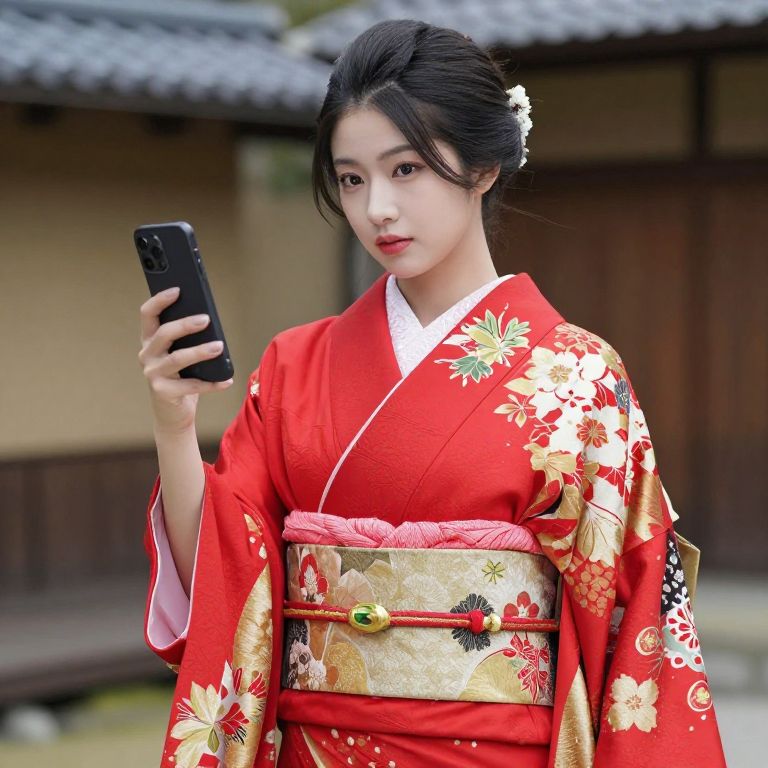 Female wearing a red and gold kimono with a floral pattern and a red belt. She is holding a black phone in her right hand and is looking at the camera.