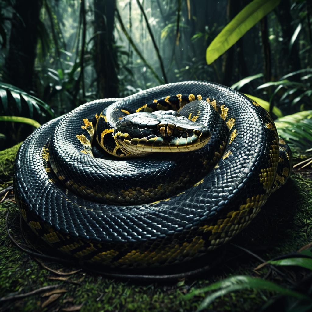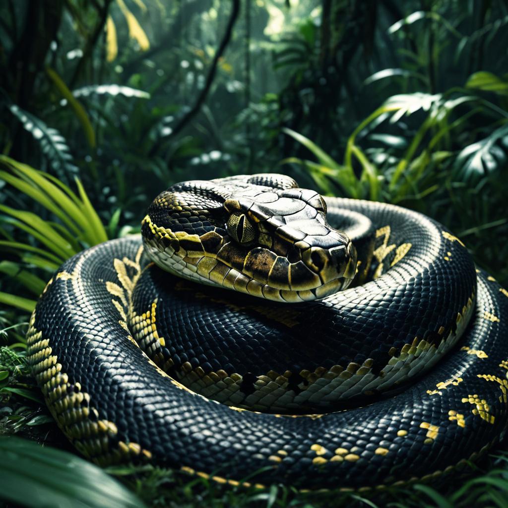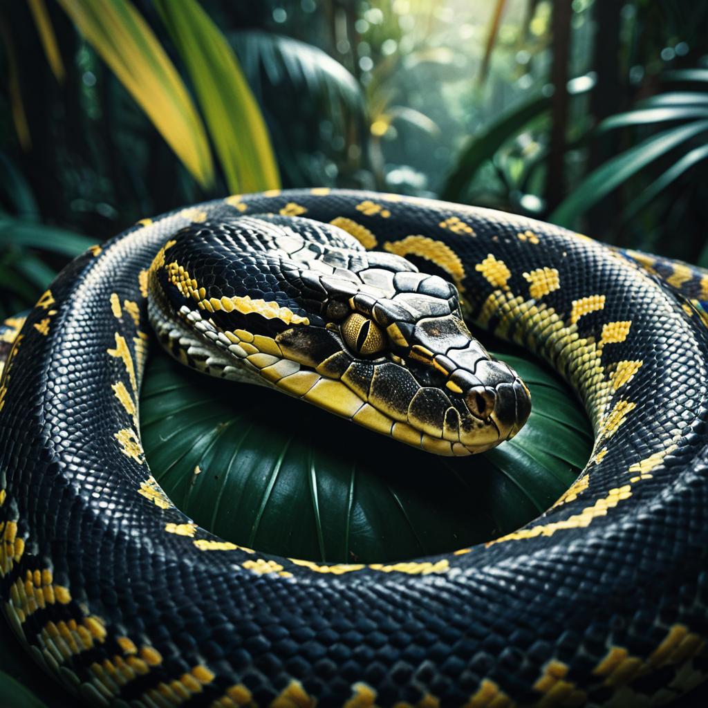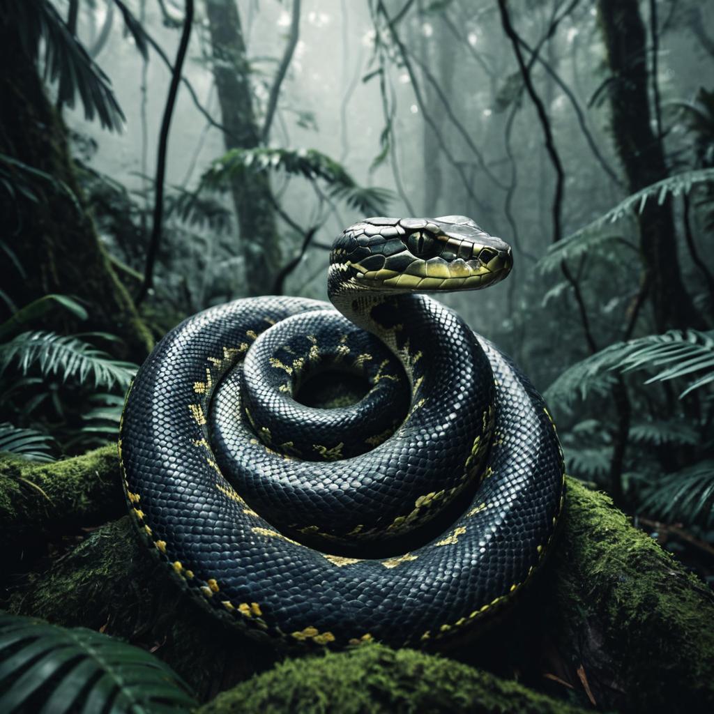 Close-up portrait of a green tree python coiled in a spiral in a lush tropical jungle, high contrast lighting, cinematic, octane render, cgsociety, artstation, 4k resolution