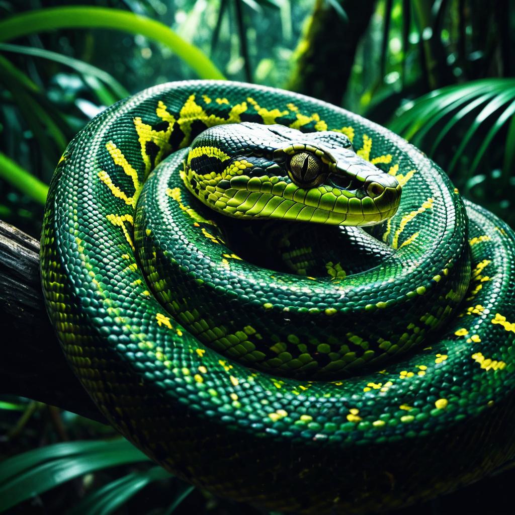 Close-up portrait of a green tree python coiled in a spiral on a tree branch in a lush tropical jungle. The snake features vibrant green and yellow scales with detailed texture, captured with high contrast lighting in a cinematic style. The dense foliage of the jungle forms a blurred background, highlighting the python's intricate scale patterns and intense eyes.