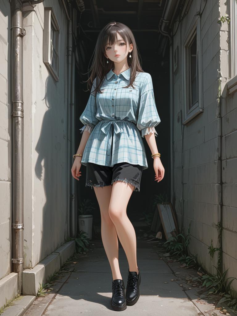 1girl, realistic face, full body shot, Woman, casual, plaid button-up shirt in navy, white, and orange, rolled-up sleeves, lightly distressed skinny jeans, brown leather open-toe platform sandals.