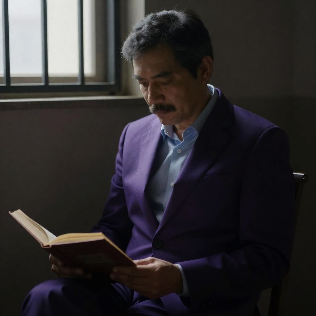 A middle-aged man with dark hair and a mustache, wearing a purple suit, reads a document in dim light. He is sitting against a dark, ured wall with a barred window behind him. His eyes are focused downward.