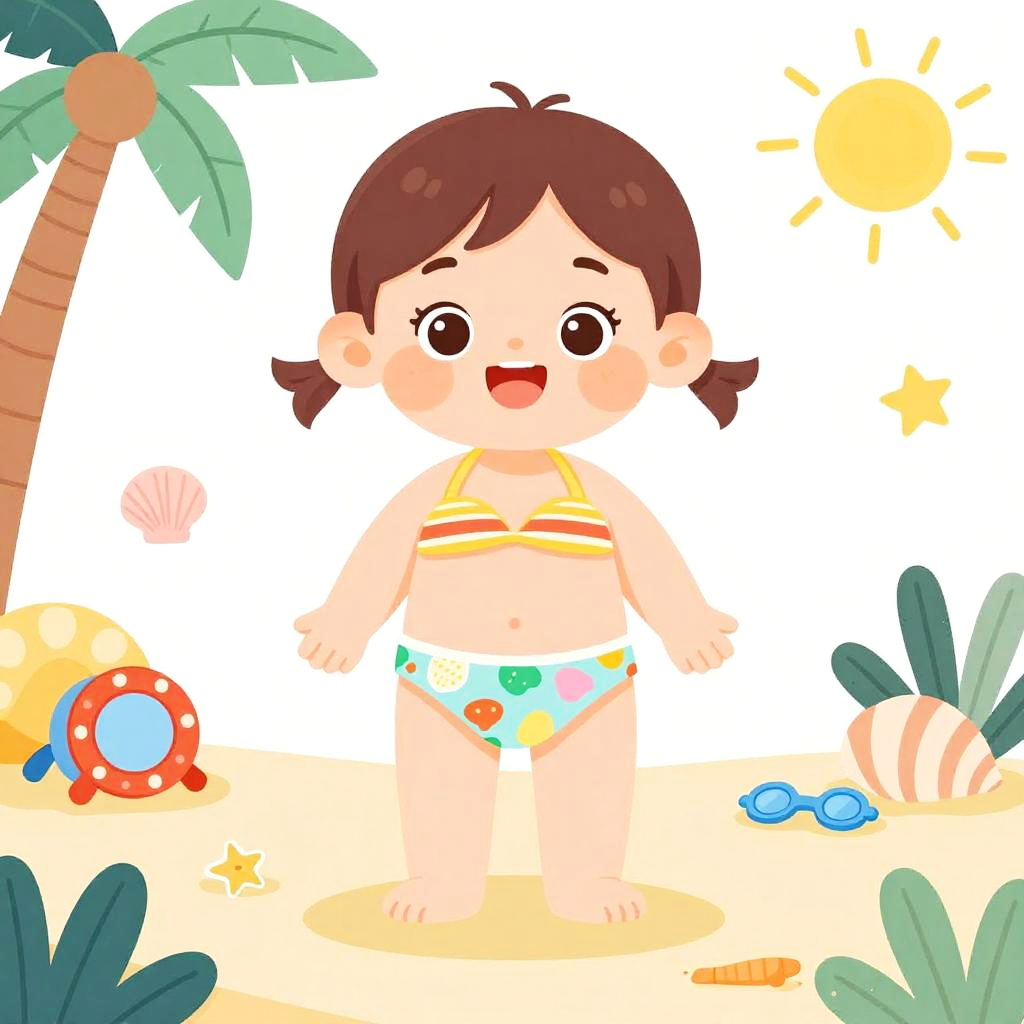 Cartoon-style drawing of a happy brown-haired girl in a yellow bikini and colorful swim bottom, standing on a sunny beach with palm trees, seash