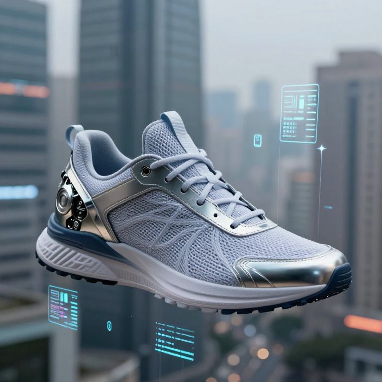 Photorealistic CGI of a futuristic athletic shoe floating against a blurred cityscape of tall, modern skyscrapers. The shoe is predominantly silver with a mesh texture, featuring metallic accents on the heel and toe. It has white laces and a thick, white, patterned midsole. Digital interface elements, including blue and white text boxes and icons, float around the shoe, enhancing its high-tech appearance. The background shows indistinct, gray buildings, adding a sense of urban environment. The overall style combines realistic textures with a sci-fi aesthetic, emphasizing modernity and advanced technology.