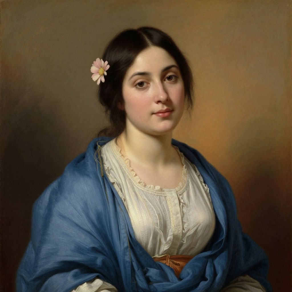 Portrait of a woman from Alvito, rendered in the style of Adolphe William Bouguereau, featuring her dark hair adorned with a delicate pink flower, wearing a cream blouse with ruffled edges and a deep blue shawl draped over her shoulders, set against a warm, gradient background.