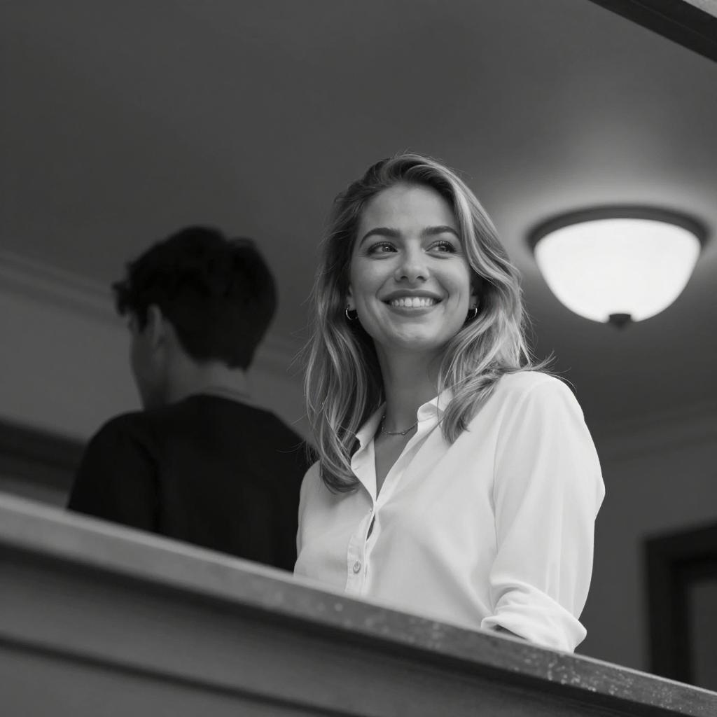 Black and white photograph of a woman with shoulder-length, light-colored hair and a smile, wearing a white blouse, standing behind a dark railing. A man with short dark hair is in the background, turned away. Ceiling light on the right.