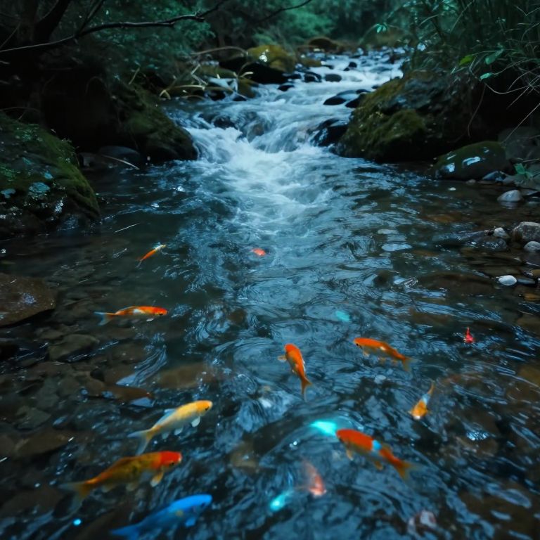 Photograph of a vibrant, fast-flowing stream in a forest setting. Brightly colored koi fish, including orange, red, blue, and yellow, swim in the clear, rushing water. The stream is surrounded by dark, moss-covered rocks and dense greenery. White foam forms at the stream's center as water cascades over rocks. The image has a rich, natural color palette, with the koi fish adding a pop of color against the dark, textured background. The scene is dynamic, capturing the movement and liveliness of the fish and water.