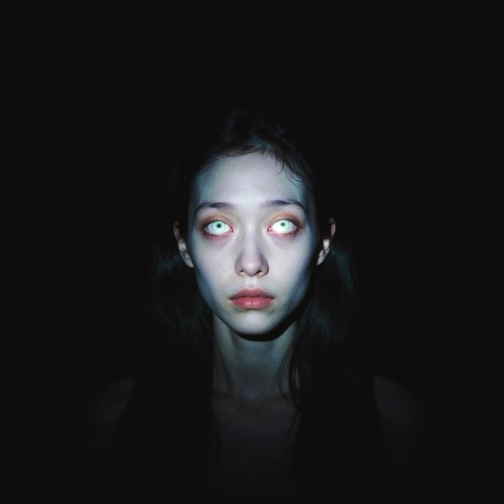 A petite woman, pale white skin, ((glowing eyes)), Brightly Lit, Highly Visible, realistic dark colors, Analog Style, Kodak Max 400 Film, 20mm f/1.8 lens, Wide Angle Shot., Whimsical yet Numb., Quirky Character Designs, dark background, silhouette, spotlight, dark theme