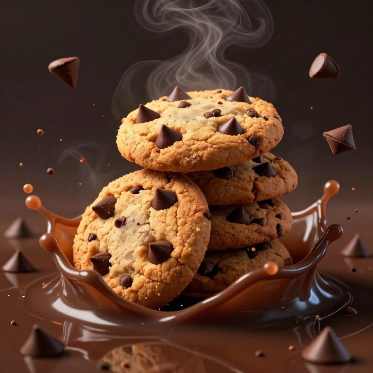 The image presents a visually striking scene of chocolate chip cookies, with a dramatic splash of liquid, likely coffee, engulfing them. The cookies, stacked in a pyramid-like formation, are generously studded with chocolate chips, their golden-brown surfaces glistening under the light. The liquid, captured in mid-splash, creates a dynamic and almost fiery effect, with steam rising from the surface, adding to the dramatic atmosphere. Chocolate chips are scattered around the base, some floating in the liquid, while others are airborne, creating a sense of motion and chaos. The overall composition is highly detailed, with a focus on the interplay of textures—crispy cookie surfaces, smooth chocolate chips, and the fluidity of the liquid. The lighting is high-key, highlighting the rich colors and creating a cinematic feel, reminiscent of Pixar animation. The spatial relationships are carefully arranged, with the cookies centrally positioned, the splash spreading outward, and the scattered chocolate chips adding depth and complexity to the scene.