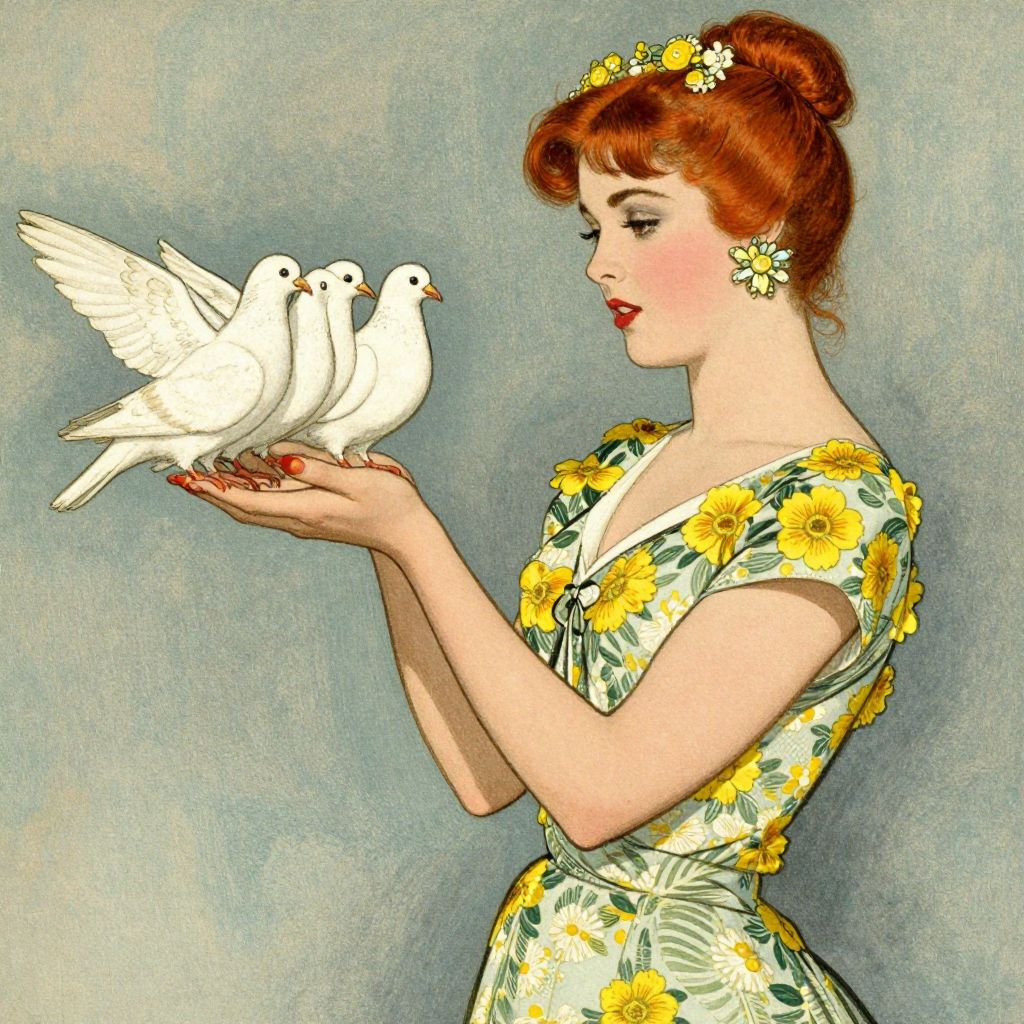 A vintage-style illustration reminiscent of Morris Hirshfield's work from 1942, featuring a woman with styled red hair and floral earrings, dressed in a retro dress adorned with yellow flowers, gently holding three pigeons on her outstretched hand against a muted, textured background.