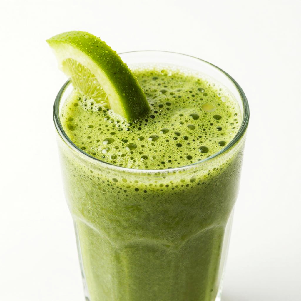 Photograph of a vibrant green smoothie in a clear glass, topped with a slice of fresh, green cucumber. The smoothie has a frothy texture, with tiny bubbles visible on its surface. The background is a stark white, making the green color of the smoothie and cucumber pop. The image has a bright, high-contrast look.
