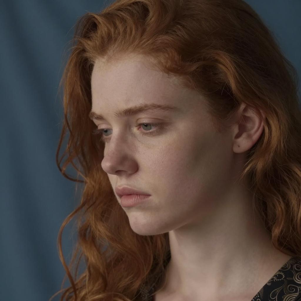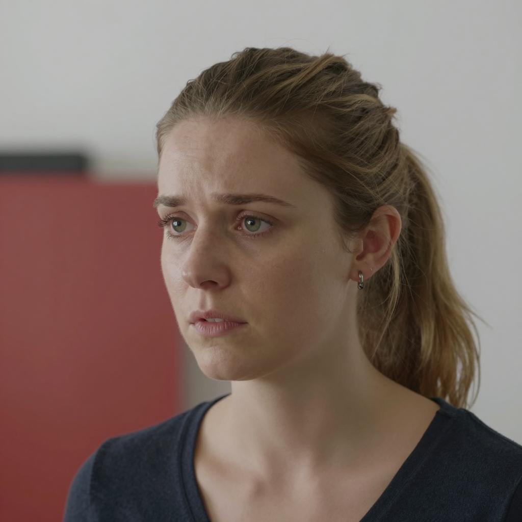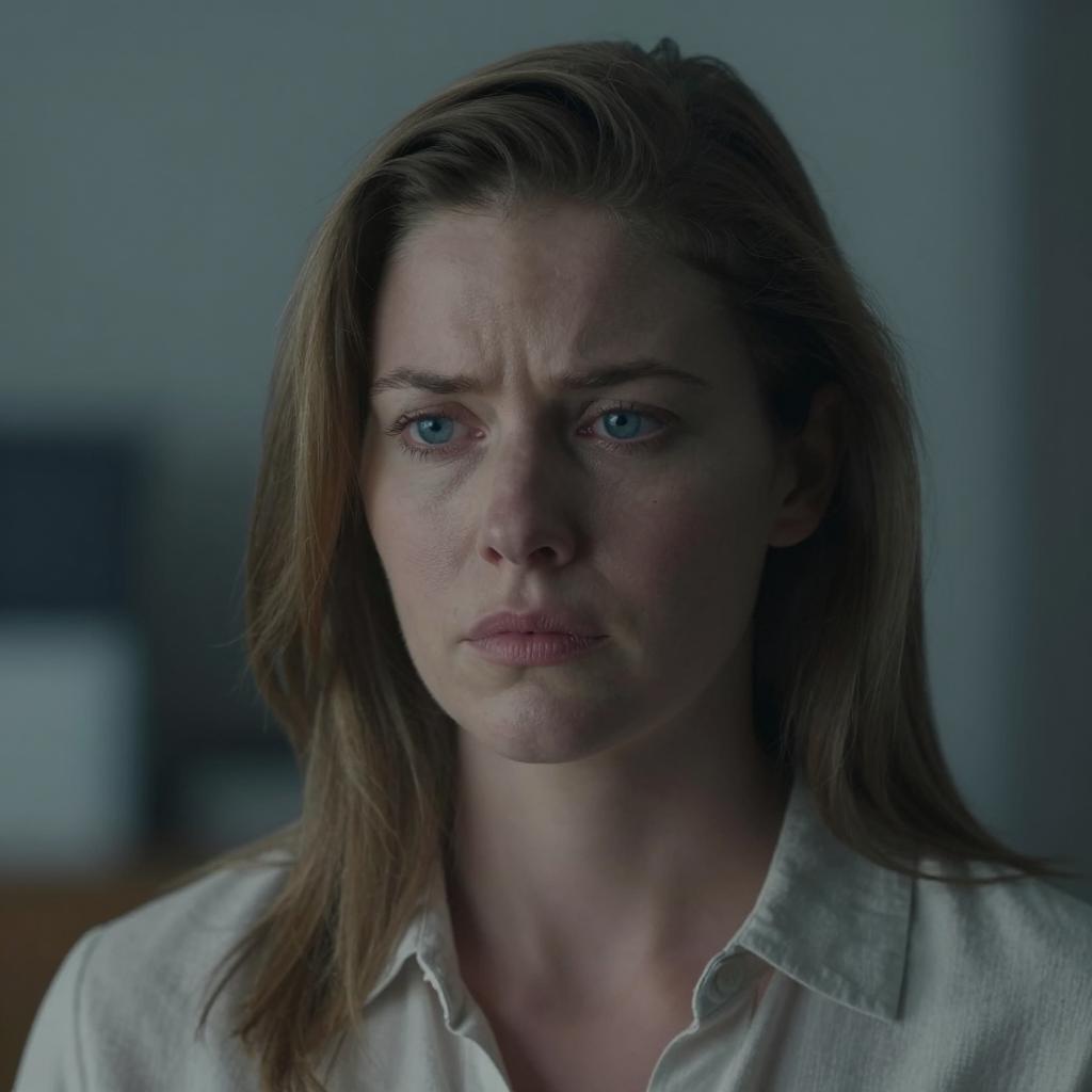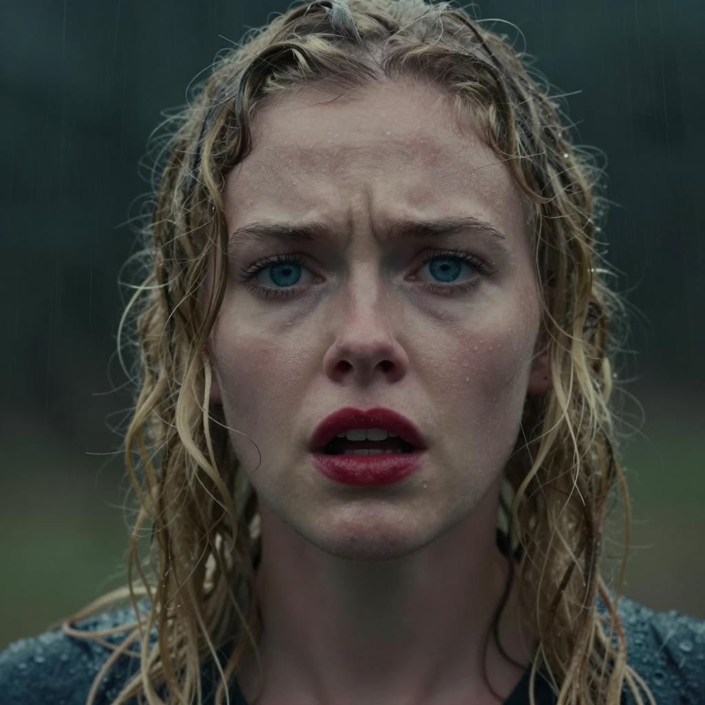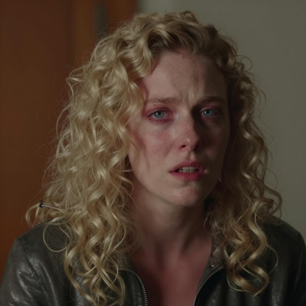A woman with curly blonde hair, pale skin, and blue eyes. She has a distressed expression with slightly open mouth and visible redness around her eyes. She wears a dark, shiny jacket. Background is blurred with orange and brown colors. Her face is slightly tilted to the right.