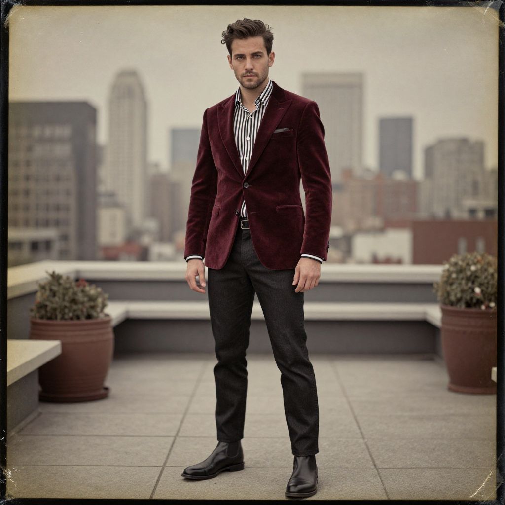 A man, burgundy velvet blazer, black and white striped dress shirt, tailored black jeans, sleek black Chelsea boots, no tie, rooftop oasis, city skyline backdrop, collodion wet plate style, confident expression Man has masculine face and piercing eyes
