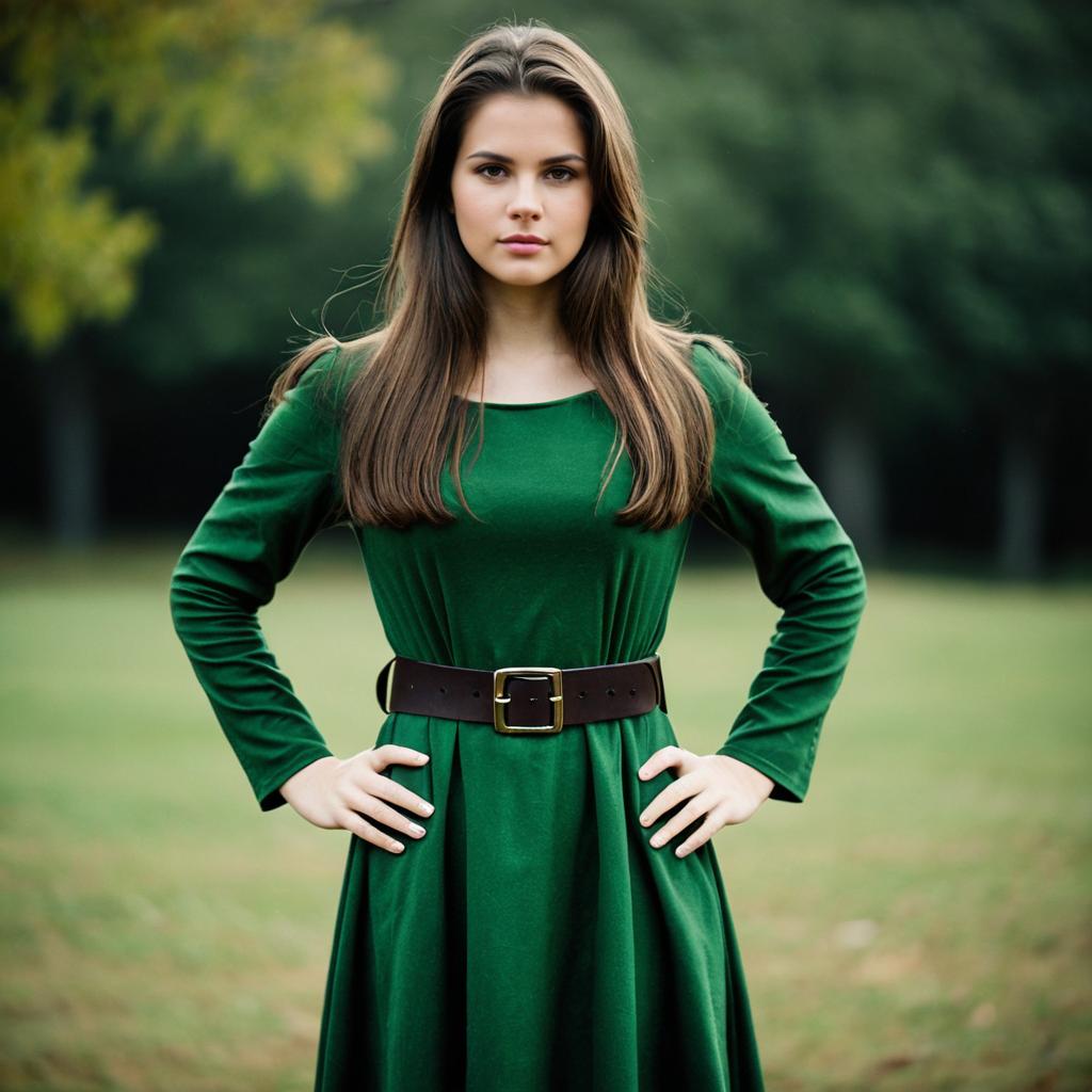 Clever girl halloween,1girl, solo, brown hair, brown eyes, short hair, belt, dress, outdoors, realistic, tree, looking at viewer, blurry, nature, blurry background, forest, green dress, standing, closed mouth, short sleeves