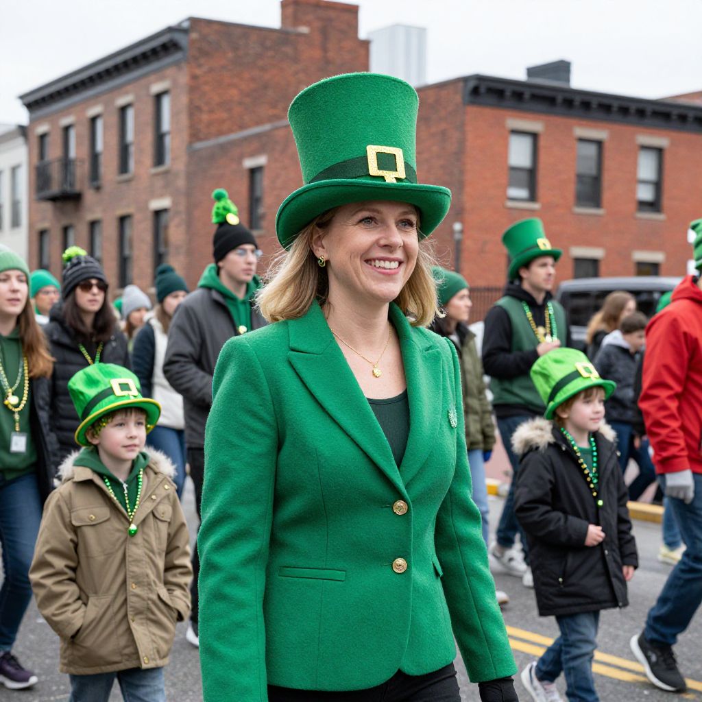Smiling woman wearing a vibrant green top hat and jacket stands prominently in New Haven's St. Patrick's Day Parade, surrounded by a lively crowd of participants also donning festive green attire, including children in matching hats and coats, all set against the backdrop of historic brick buildings.