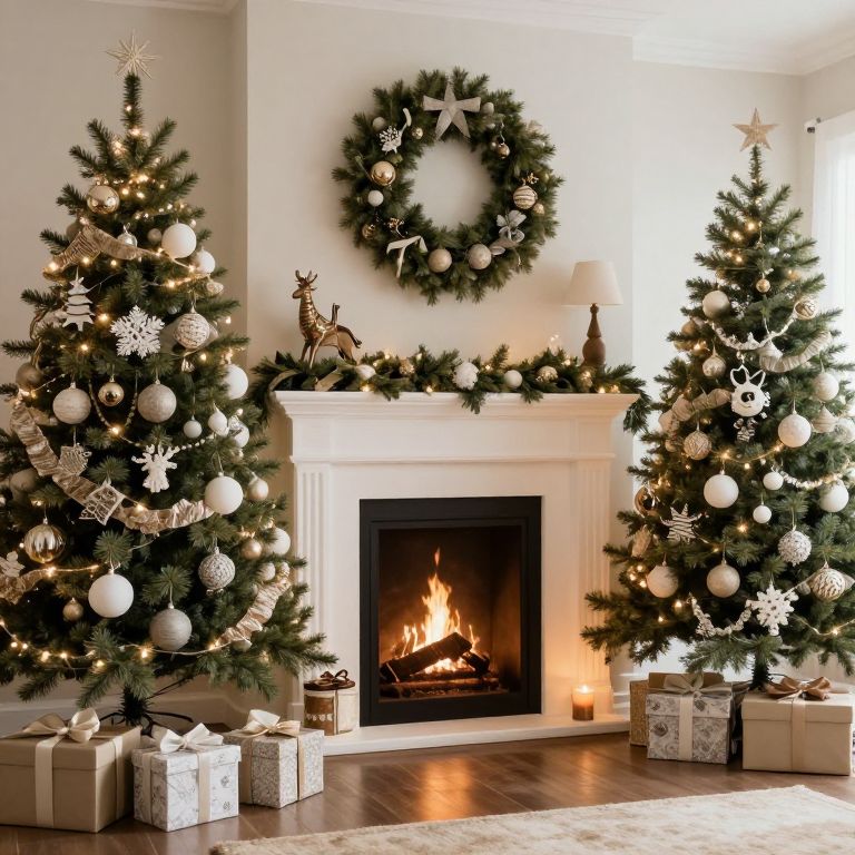 Photograph of a cozy, Christmas-themed living room featuring two tall, decorated Christmas trees with white and silver ornaments, lights, and snowflakes. The trees flank a white fireplace with a lit fire, topped with a green wreath adorned with silver baubles and a star. The mantel is decorated with a small reindeer and candles. Beneath the trees are wrapped presents in white and silver paper. The room has dark wooden floors and a light gray wall, with soft natural light illuminating the scene.