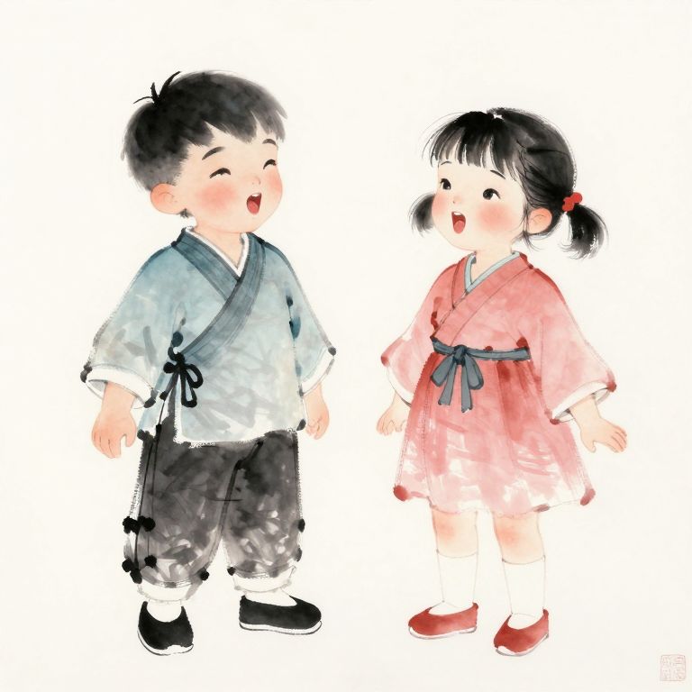 Traditional Chinese Ink Painting of Singing Kids