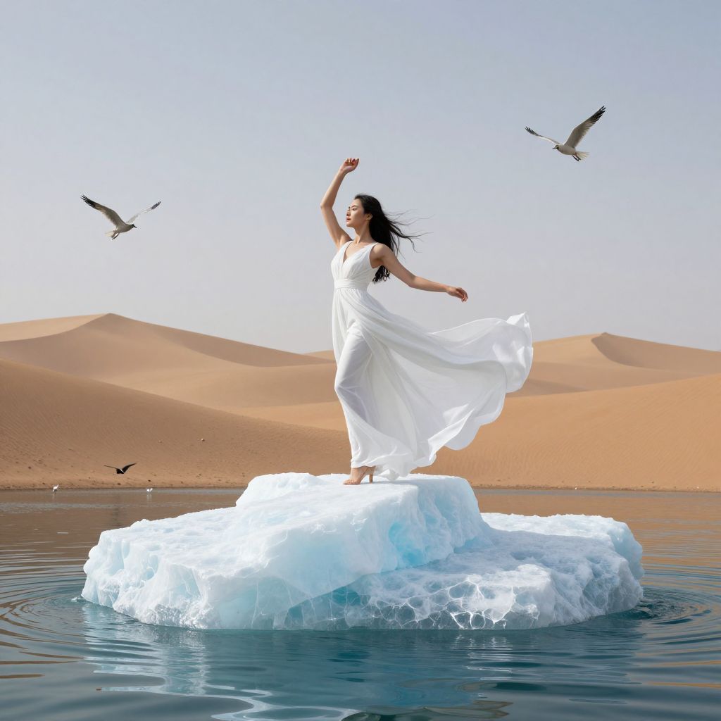 Photograph of a woman in a flowing white dress standing on an ice floe, arm raised, surrounded by desert sand dunes, with birds flying