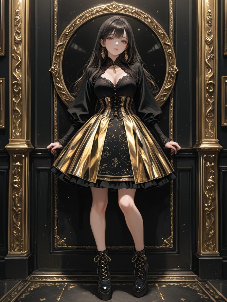1girl, realistic face, full body shot, Woman, trendy fashion, lace-up bodice with deep V-neck in burgundy, long sleeves, fitted silhouette, metallic striped mini skirt in horizontal pattern, colors black and gold, no visible accessories.