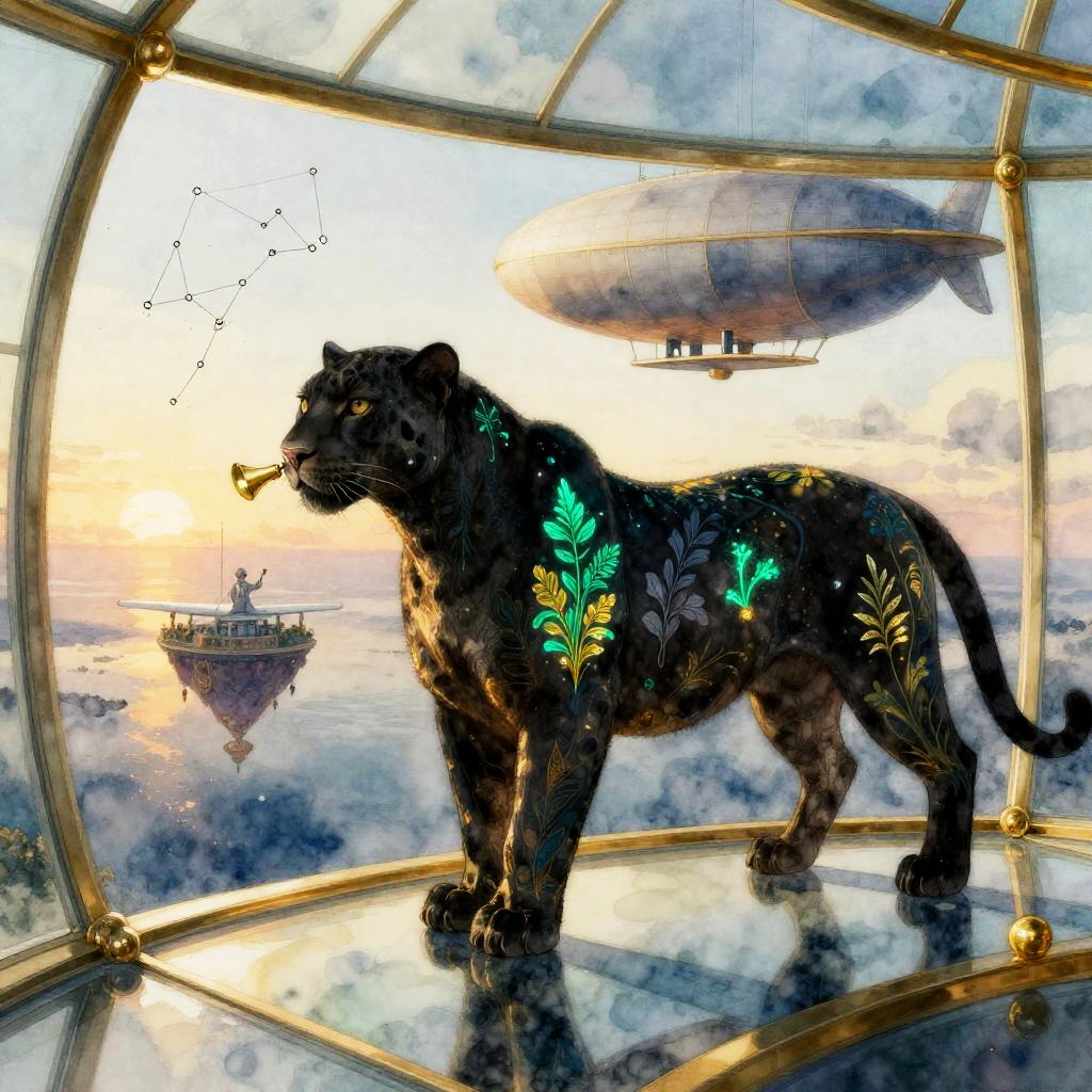 A skyship navigator sketching living constellations with a brass sextant in a glass-and-brass aerodrome above a floating archipelago at golden hour, inspired by Art Nouveau. Featuring a majestic black panther with bioluminescent botanical tattoos and electric emerald-and-gold highlights. The artwork showcases exceptionally high resolution and clarity, immersed in a dazzling watercolor style with bright, iridescent hues in 32k detail.