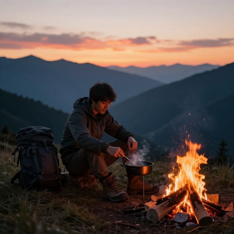 Photograph of a young man with short brown hair, sitting by a campfire at dusk in a mountainous area. He wears a dark jacket and brown boots, focusing on cooking in a black pot over the fire. A large backpack is beside him on the grassy ground. The fire casts a warm glow, illuminating his face and hands. The background features a stunning sunset with orange and pink hues, silhouetting the mountain range. The scene exudes a sense of tranquility and adventure.