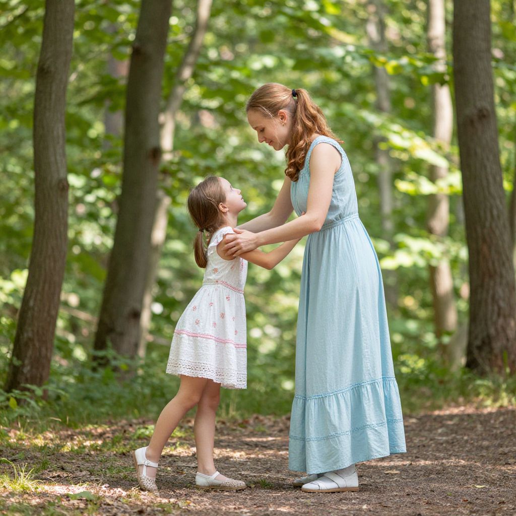 Photograph of a tender forest scene featuring a young woman with fair skin and brown hair in a ponytail, wearing a light blue, knee-length, lace-trimmed dress and white sneakers, gently holding the hands of a small girl with light brown hair in a white, short-sleeved, lace dress and white sneakers. The background is a lush, sunlit forest with tall trees and a dappled ground. The woman looks down lovingly at the girl, who gazes up at her. The overall atmosphere is serene and nurturing.