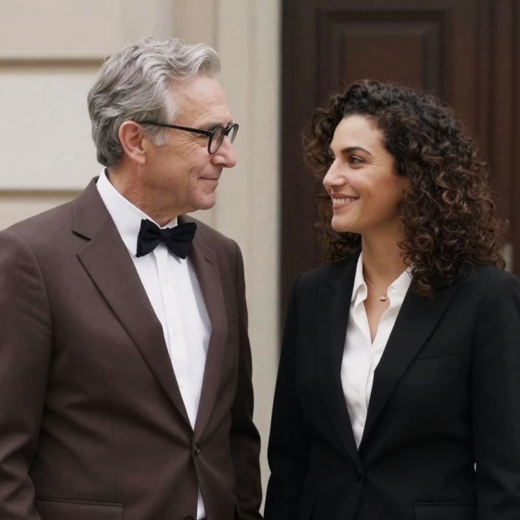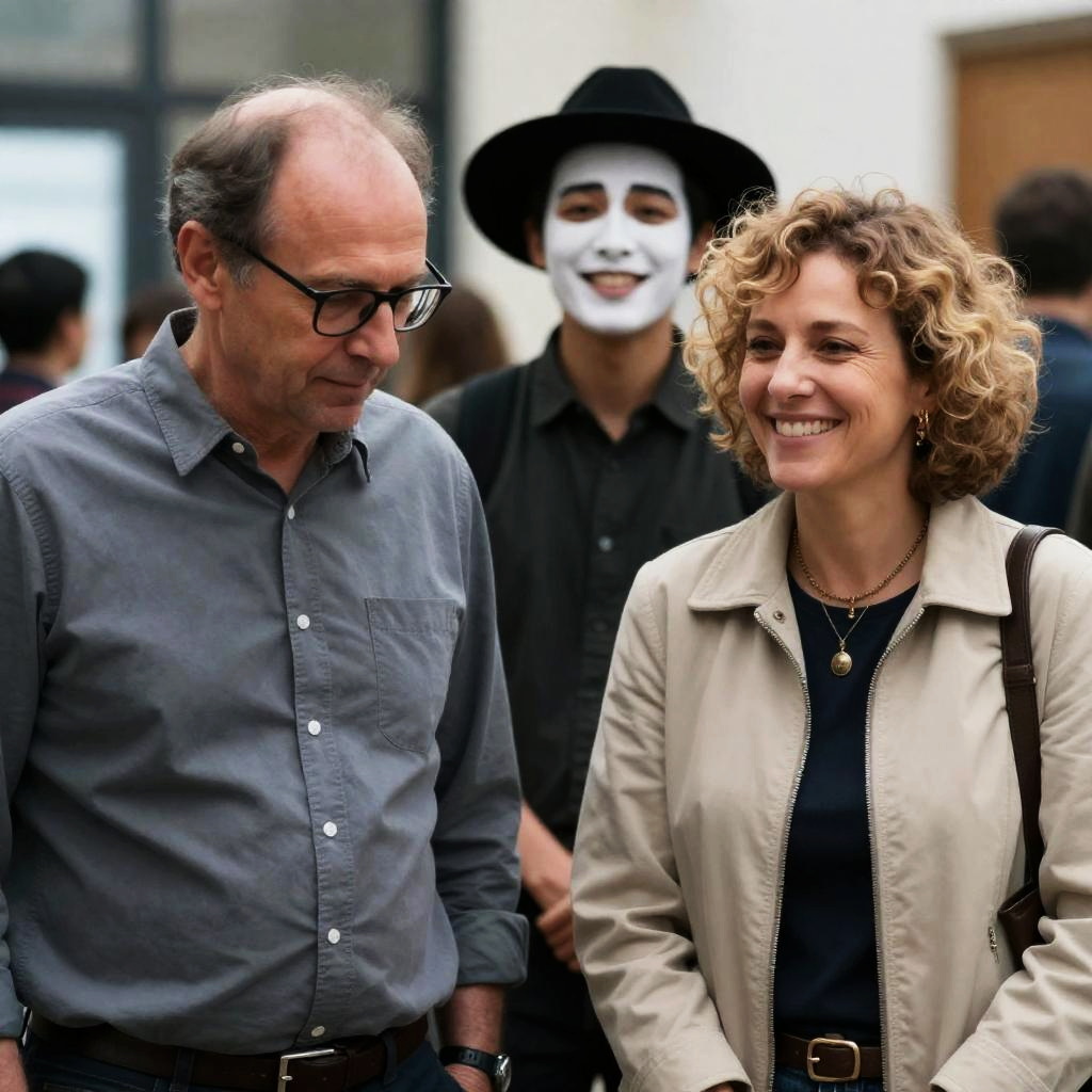 Photograph of three people in a busy indoor setting. A middle-aged man with thinning hair and glasses in a gray shirt stands to the left, looking down. A woman with short, curly blonde hair and a beige jacket stands to the right, smiling. A person with a white-painted face and black hat stands behind them, smiling. The background shows blurred figures and a glass window.