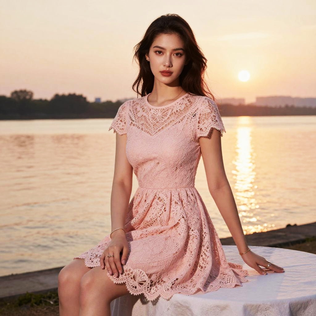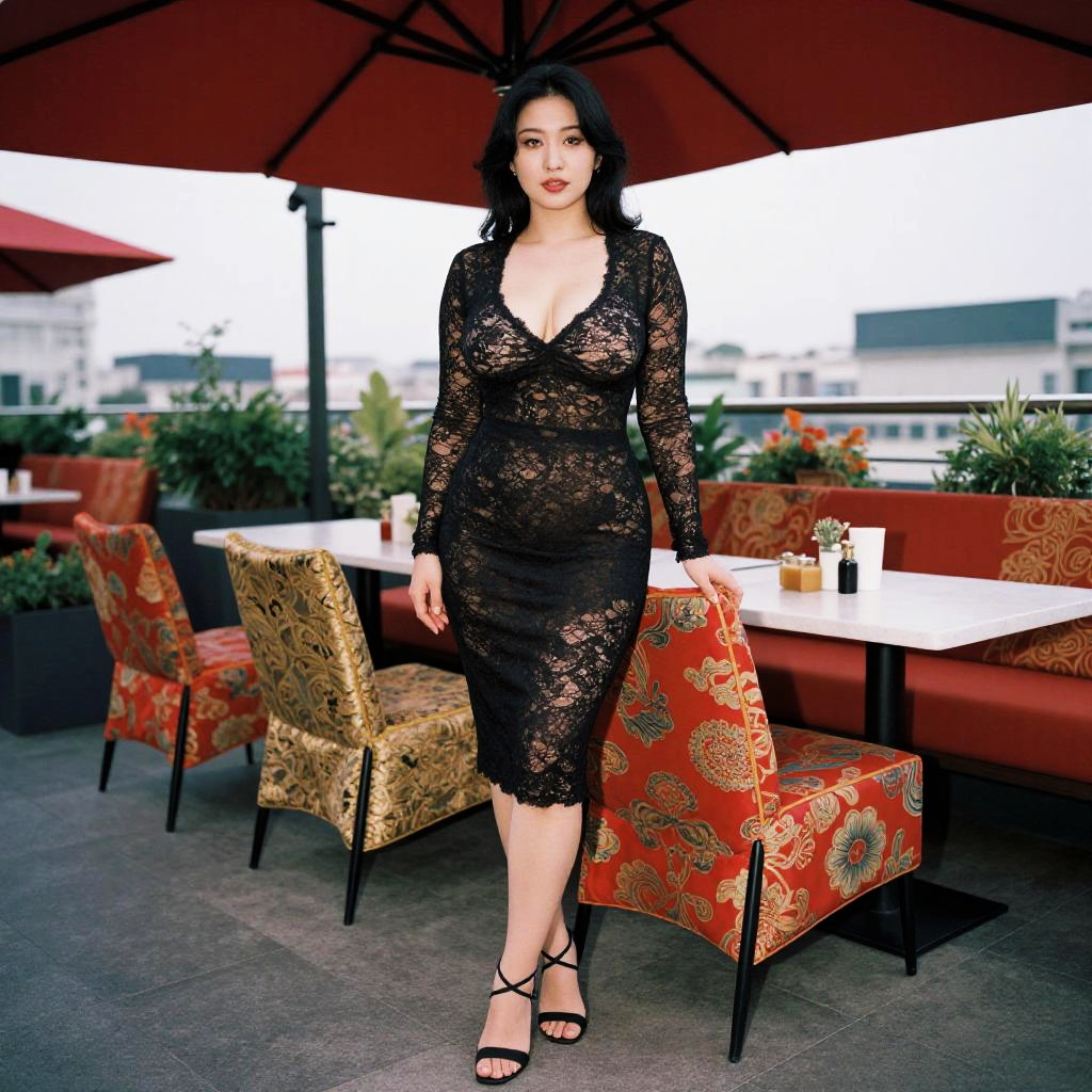 A Curvy woman in a vintage photo style, wearing a bright yellow sleeveless midi dress with a relaxed fit and light purple low-top sneakers, walking along a sandy shore during a dusk beach dinner. Sexy. Pretty face and beаutiful eyes. Big breasts BREAK chinese, asian, traditional Chinese aesthetics, delicate brushwork, ink wash painting textures, vibrant red and gold accents, elegant Asian female, silk fabrics, ornate patterns, soft lighting, ethereal atmosphere