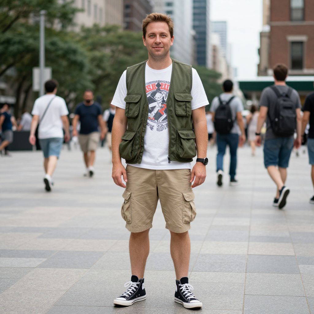 A man, utility vest in olive green, white graphic tee, khaki cargo shorts, black high-top sneakers, bustling city square, technicolor analog film stock, relaxed smile, vibrant energy. Man has masculine face and piercing eyes