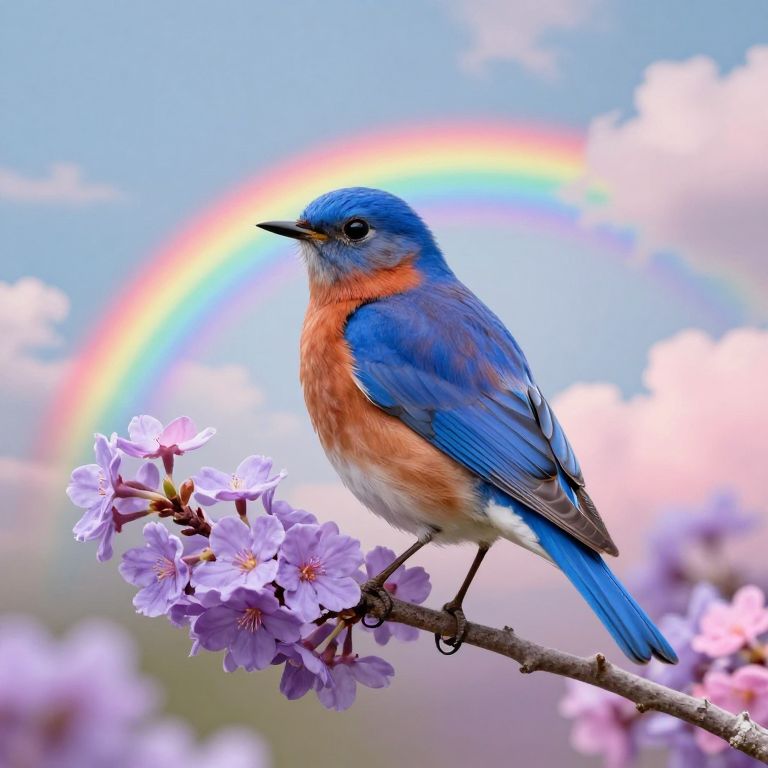 The image presents a striking double exposure of a bluebird, with its vibrant blue and orange feathers blending seamlessly with the background. The bird is perched on a branch adorned with clusters of purple and pink flowers, adding a touch of nature's beauty to the scene. Surrounding the bird, colorful clouds and a rainbow arch gracefully intertwine, creating a sense of depth and dimension. The overall composition is a harmonious blend of natural elements and artistic manipulation, with pastel colors and soft textures dominating the visual experience. The bird, flowers, clouds, and rainbow are all intricately positioned, creating a balanced and visually captivating image.