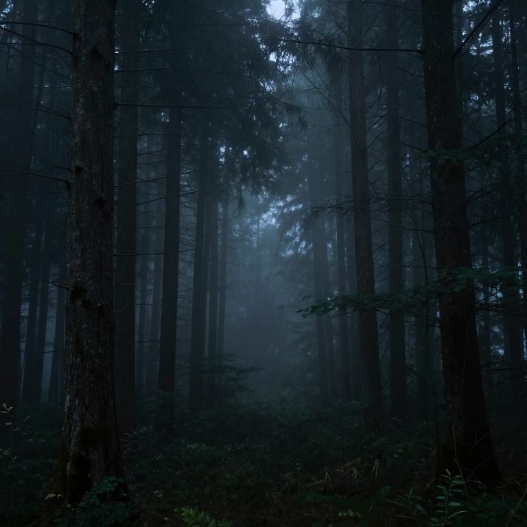A moody, atmospheric forest with tall, dark trees shrouded in mist, creating a sense of mystery and solitude.