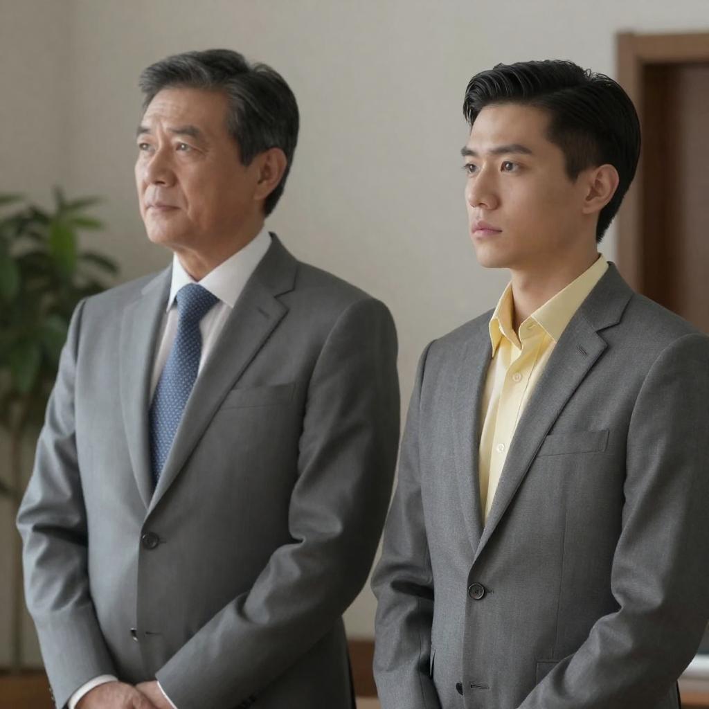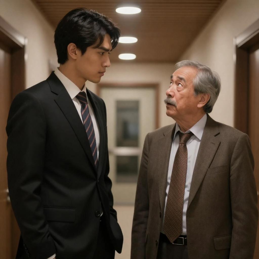 Photograph of two men in a hallway. Young man with dark hair, black suit, white shirt, striped tie, side profile, serious expression. Older man with gray hair, mustache, brown suit, patterned tie, surprised expression, looking up at young man. Wooden ceiling, recessed lights, mirrored door background.