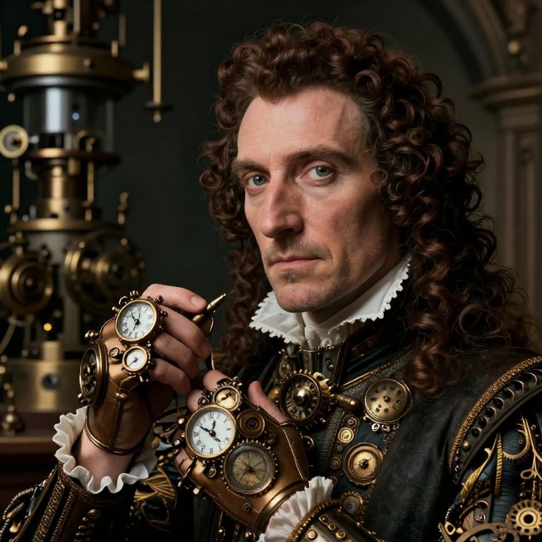 Create a Renaissance-inspired portrait with steampunk influences, showcasing an inventor adorned in clockwork accessories on their hands and clothing. The close-up reveals intricate facial details enhanced by period makeup. In the background, a partially visible mechanical contraption blends Victorian aesthetics with futuristic elements, casting an ethereal light that accentuates the inventor's skin and attire, evoking a sense of wonder and intrigue.