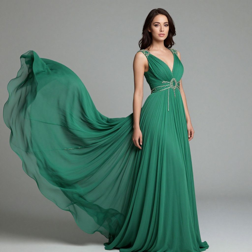 Photograph of a beautiful woman with medium-dark skin and shoulder-length black hair, wearing a floor-length, sleeveless, deep emerald green gown with a V-neckline and a beaded belt. The gown's fabric flows gracefully in the wind, creating a dynamic, swirling effect. She stands against a simple, light grey background, looking slightly to her left with a calm, confident expression. The dress is elegant and flowing, with delicate pleats and a fitted waist that accentuates her figure. The lighting is soft, highlighting the texture and color of the fabric.