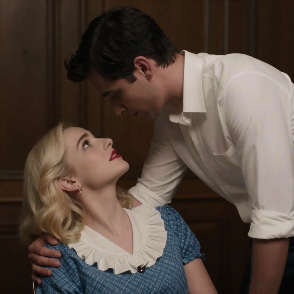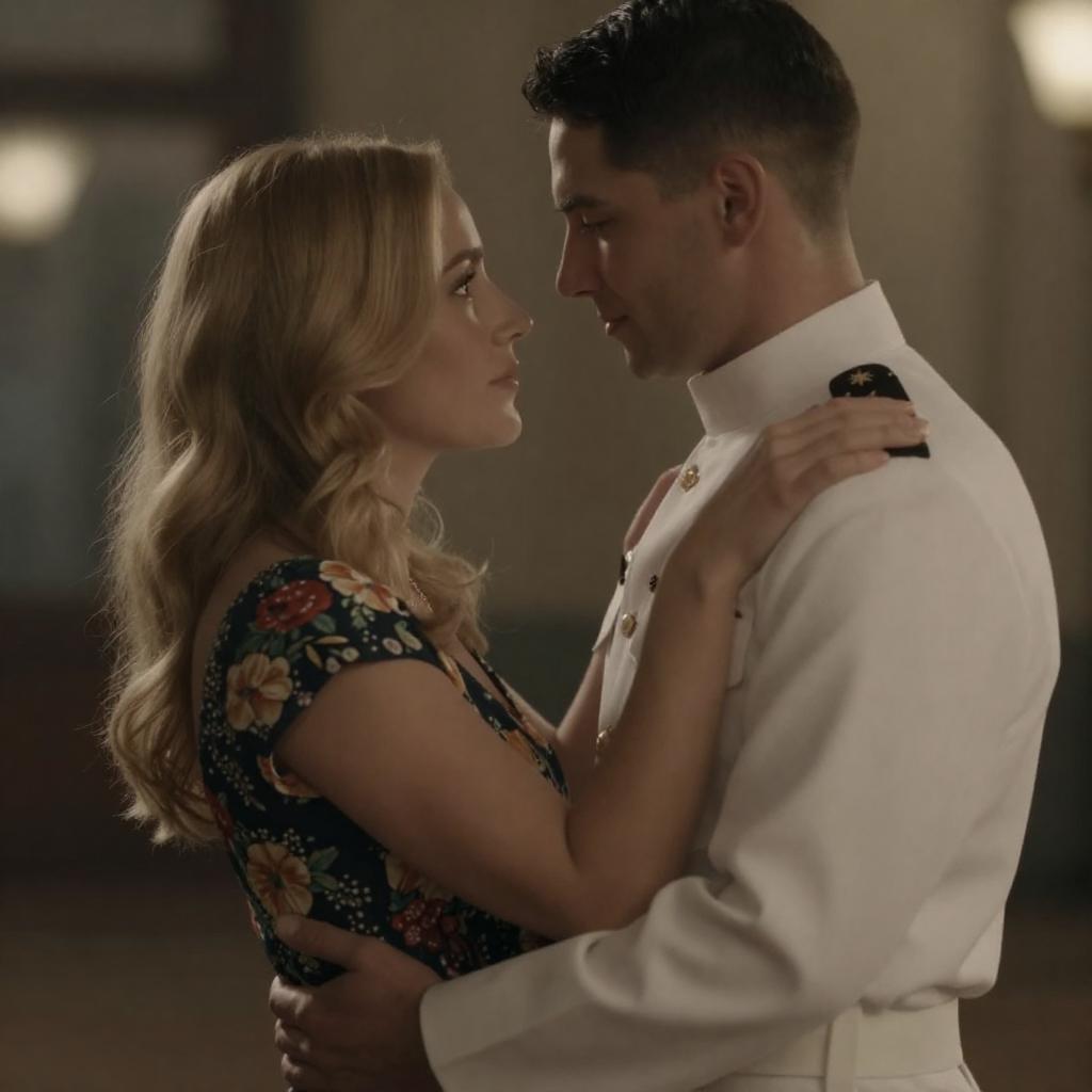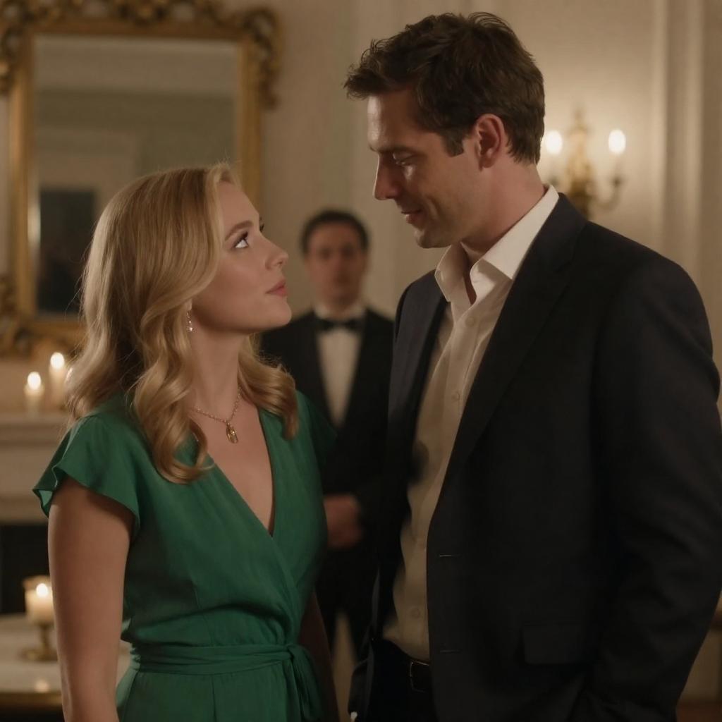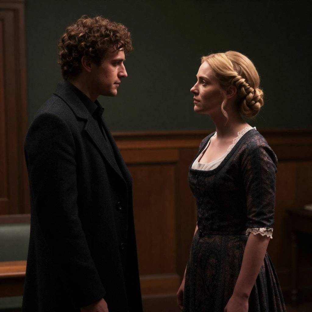 Photograph of a woman and man standing in a wooden-paneled room. The woman, with blonde hair and a cream-colored, lace-trimmed dress, gazes up at the man. The man, with long brown hair and a brown patterned coat, looks down at her. Both have soft, intimate expressions. The woman's left hand rests on his arm. Floral wallpaper on the left and a closed wooden door on the right.